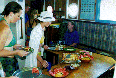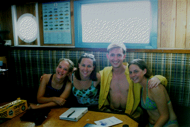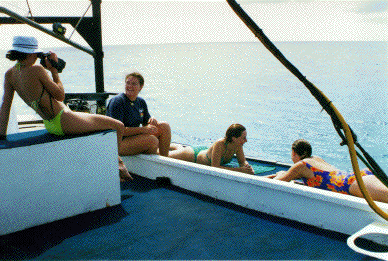 | Lazing on the roof between dives. That's Kristi filming Sarah, with Jana and Laura lying in the sun. | |