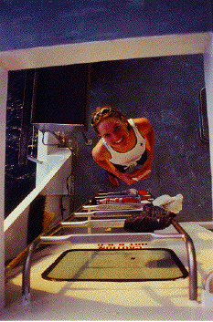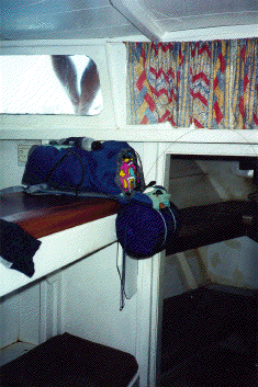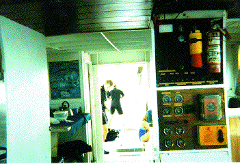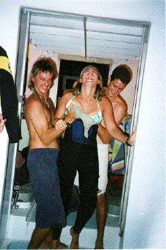 | Looking from the helm, through the eating area, to the dive deck. Lars putting on his weight belt, Nicole facing away, and Rieman sitting. | |