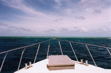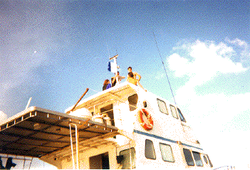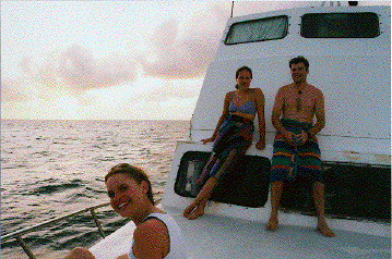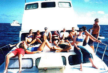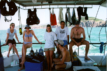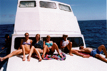 | Joy, Nicole, Brett, Ben, and Jason enjoying the sun on the foredeck after a dive. Skipper Luis looking round the corner. | |