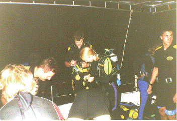 | Divers suiting up for a night dive: The back of Melissa's head, Brett, unknown body bending over, Lex and Nicole ready to go, Rieman in Stephanie's wetsuit, and Jason. | |
