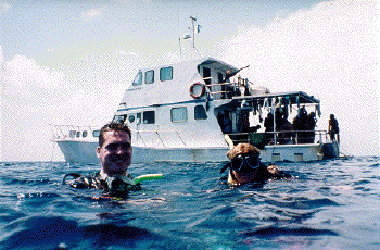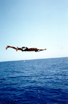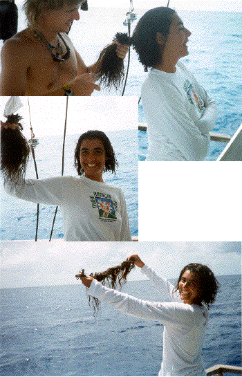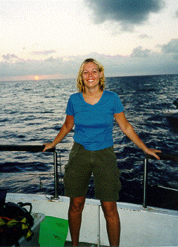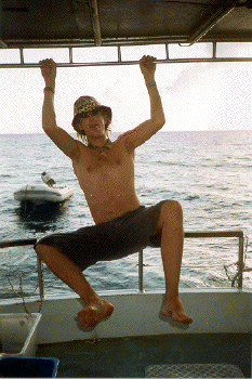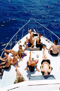 | Relaxing on the foredeck, on the way from Myrmidon to Dip Reef.