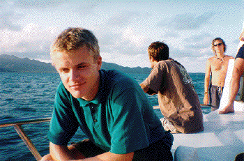 | Erik on the foredeck, on the way home going past Magnetic Island.